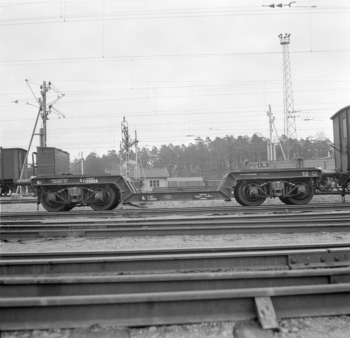 Transformatortransportvagn SJ Q1 100028. Bromshytten på vagnen har bytts ut mot ett lägre verktygsskåp.