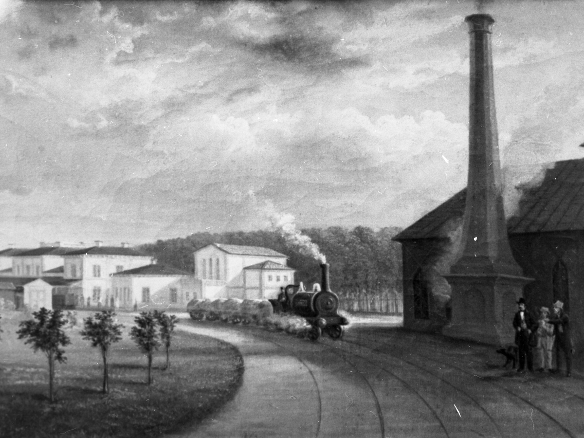 Gamla stationshuset, vita huset mitt i bilden hotell Fenix, huset vid skorstenen är verkstad. Målning av Albert Blombergsson