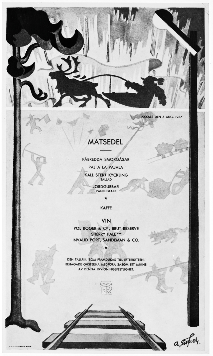 Matsedel från festmiddagen vid invigningen av Inlandsbanan.
