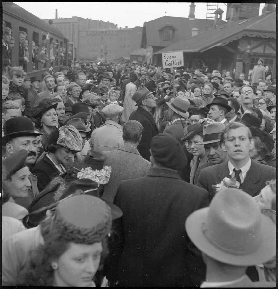 Anhöriga i väntan på ankomsten av de hemvändande flyktingarna. Köpenhamns frihamn. Skylt med text: Svend Gottlieb.