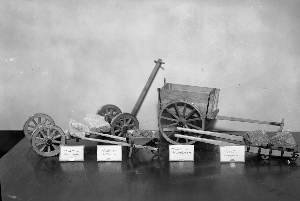 Modeller av kärror; Järnvägsmuseet. Stenvagn Skottkärra Storkärra Rullbjörn