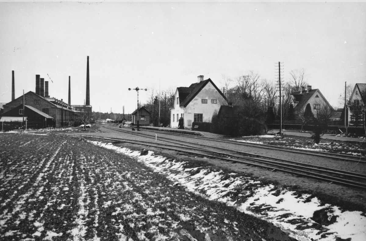 Ekebybruk järnvägsstation uppfördes 1912 av Uppsala - Enköpings Järnvägar. Den var belägen alldeles intill tegel- och keramikbruket Ekeby Bruk, som syns till vänster. Järnvägen anslöt här till Ekeby Bruks industrispår.