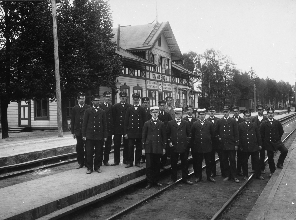 Stationsinspektor H V Bergdahl med personal vid Emmaboda järnvägsstation.