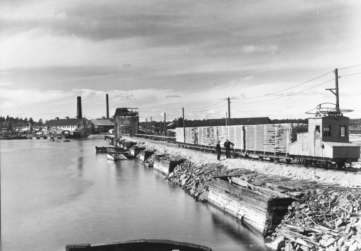 Sågen i Norrsundet. Ackumulatorlok med vagnar på väg till brädgården.