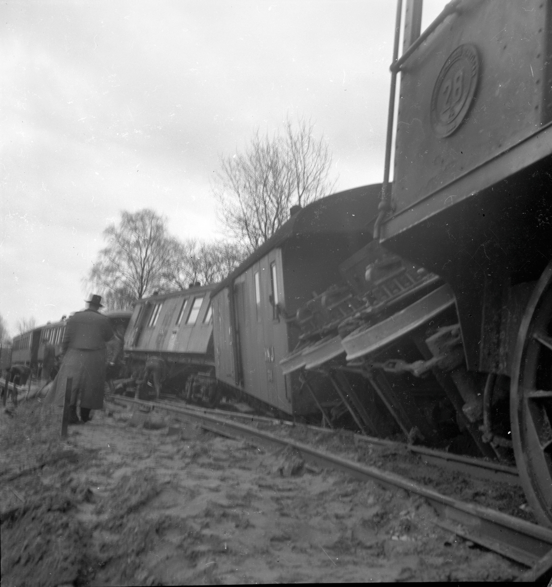 Tårurspårning vid Bredaryd. Tåget var på väg till Halmstad. Det tillhörde Halmstad-Nässjö Järnvägar, HNJ, och drogs av ångloket HNJ 28 och bestod av fyra vagnar. En resgodsvagn, HNJ F3 761, en postvagn HNJ 19 och två personvagnar däribland HNJ 1011.