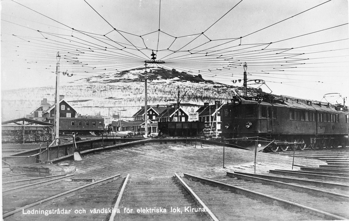 Statens Järnvägar, SJ Of. Ledningstrådar och vändskiva för el-lok. Luossavaara i bakgrunden.
