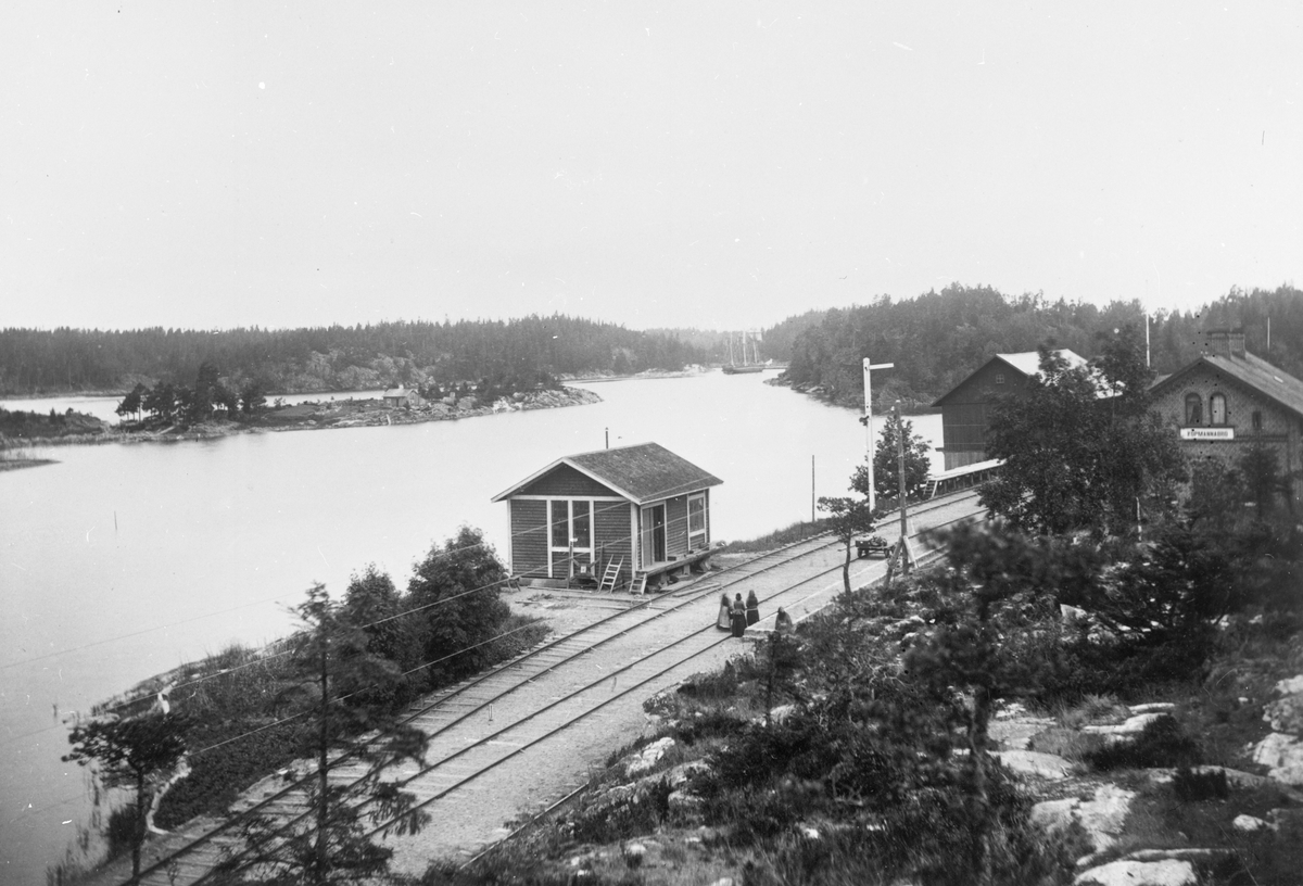 På spåret nedanför plattformen står fyra kvinnor och samtalar