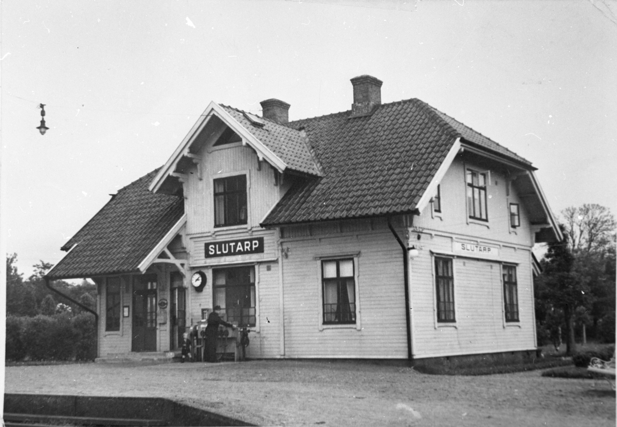 Titel: Slutarp station. Bilden tagen vid filmproduktion med anledning av Västra Centraljärnvägen och Halmstad - Nässjö Järnvägasr förstaligande. På bilden Johan Sigfrid Hjertstrand med sonen Jan ao Hjertstrand.
