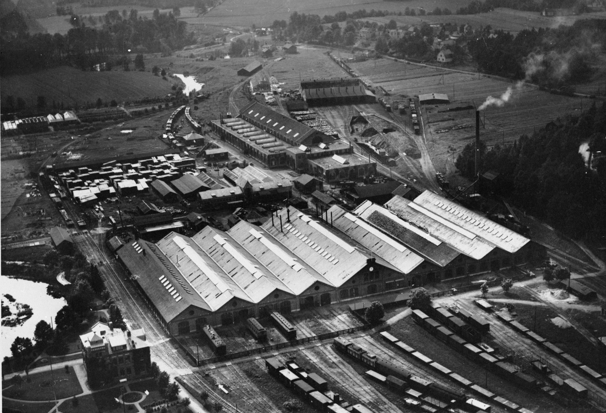 Flygbild över Bergslagernas Järnvägars verkstad.