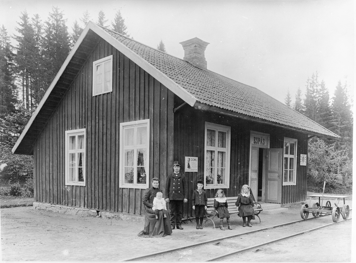 Hållplats anlagd 1874. Envånings stationshus i trä. Stins med familj.