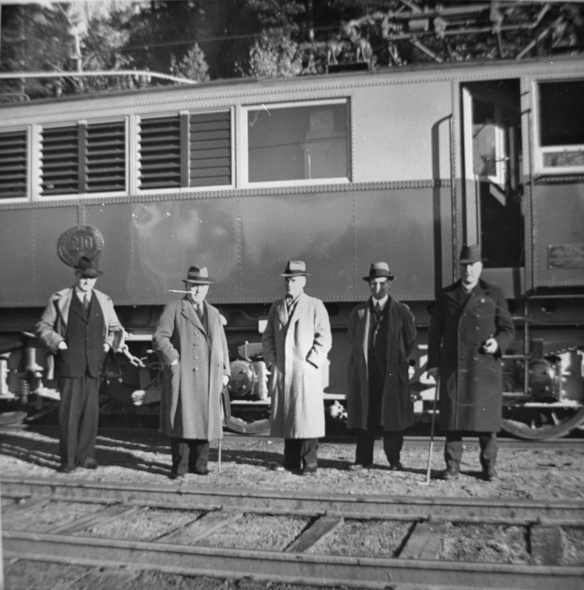 Bergslagernas Järnvägars personal. Provkörning av BJ O 210. Loket tillverkades 1939 av Asea, tillverkningsnummer 990. Övergick 1948 till Statens Järnvägar, SJ Bk730. Skrotad 1976 i Vislanda.