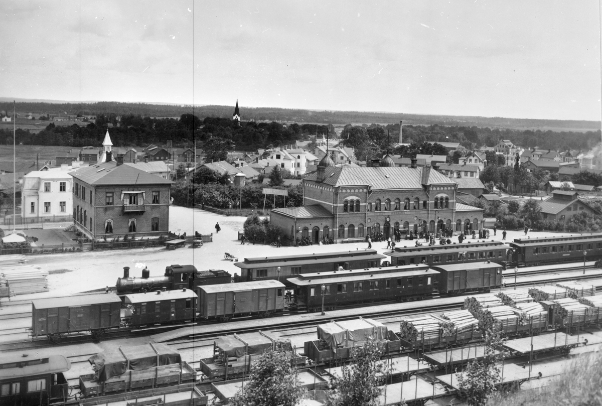 Stadens första stationshus byggdes mellan 1877- 1899. Huset revs 1995. En omfattande ombyggnad och utvidgning an bangård gjordes i slutet av 1940-talet.