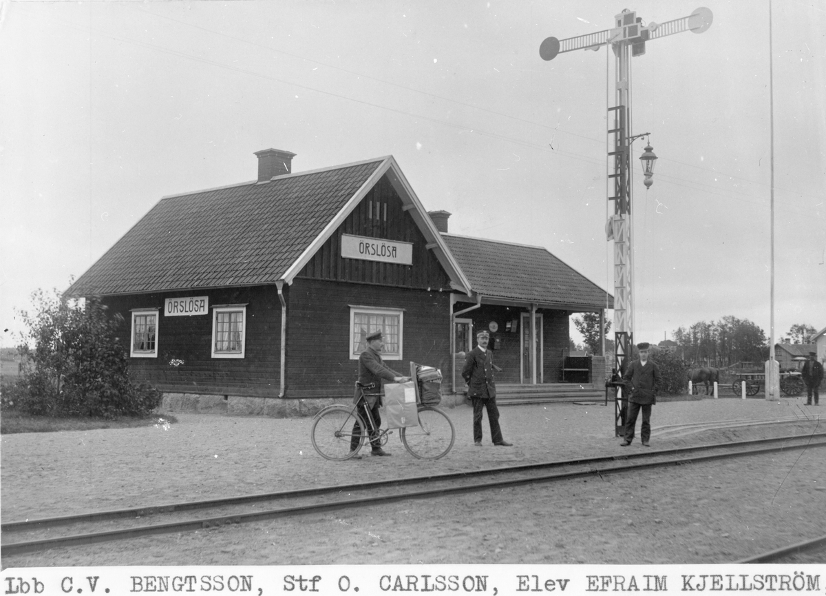 Stationen öppnades för allmän trafik 1908. Upphörde 1939. På bilden syns landsbrevbärare C.V. Bengtsson, stationsföreståndare O. Carlsson och elev Efraim Kjellström.
