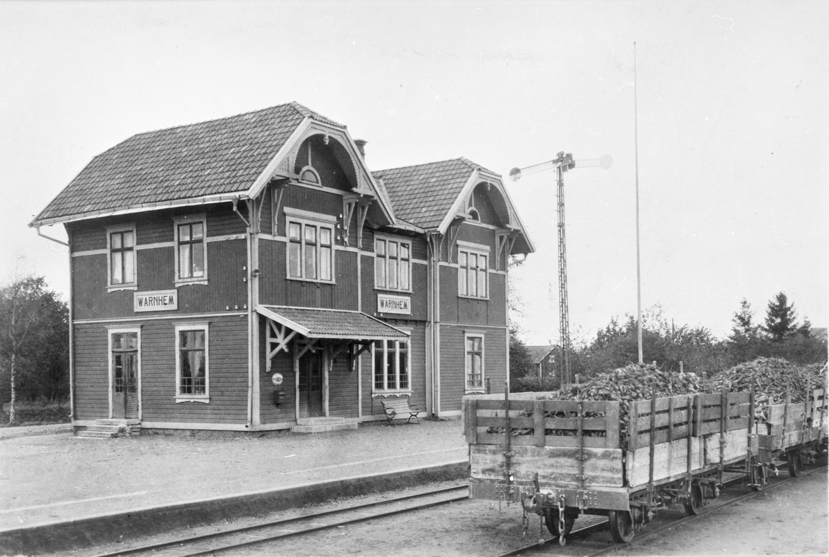 Skövde - Axvalls Järnvägs stationen i Varnhem. Trafikplats anlagd 1902-03. Byggnaden utökades med en tillbyggnad 1914-15. Tvåvånings träbyggnad med två gavlar mot banan. Den renoverades sedan 1944 igen.