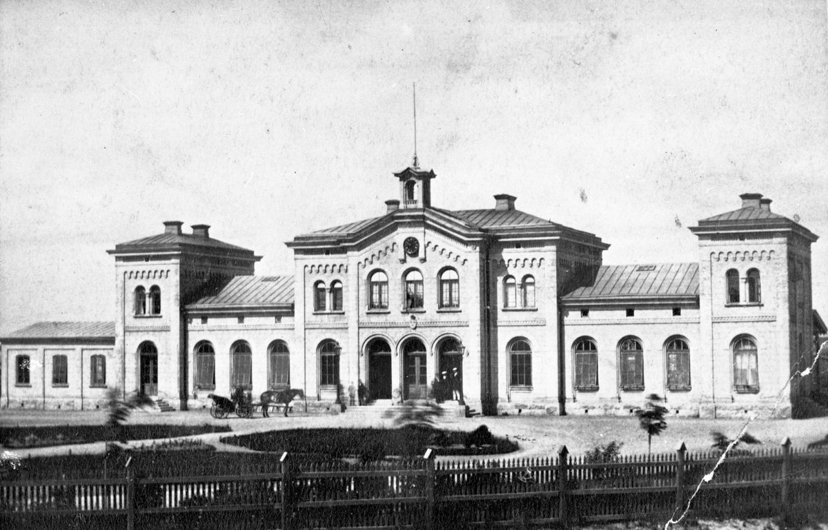 Centralstationen från gatusidan. Örebro station öppnades för allmän trafik 1862. Stationshuset ritades av Adolf Edelsvärd. Det byggdes av sten och täcktes med plåttak. Både stationshuset och bangården har ombyggts flera gånger under tiden.