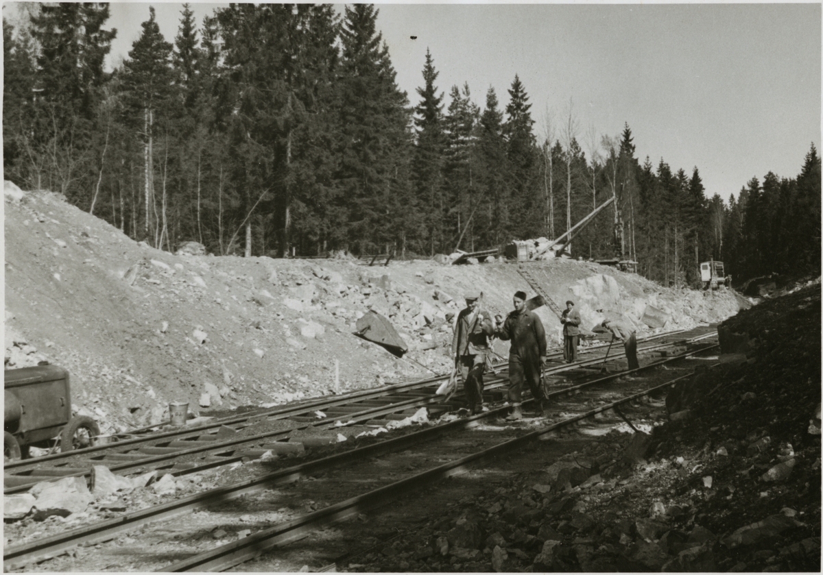 Grävarbete pågår vid en skärning på Trafikaktiebolaget Grängesberg - Oxelösunds Järnvägar, TGOJ:s banor.