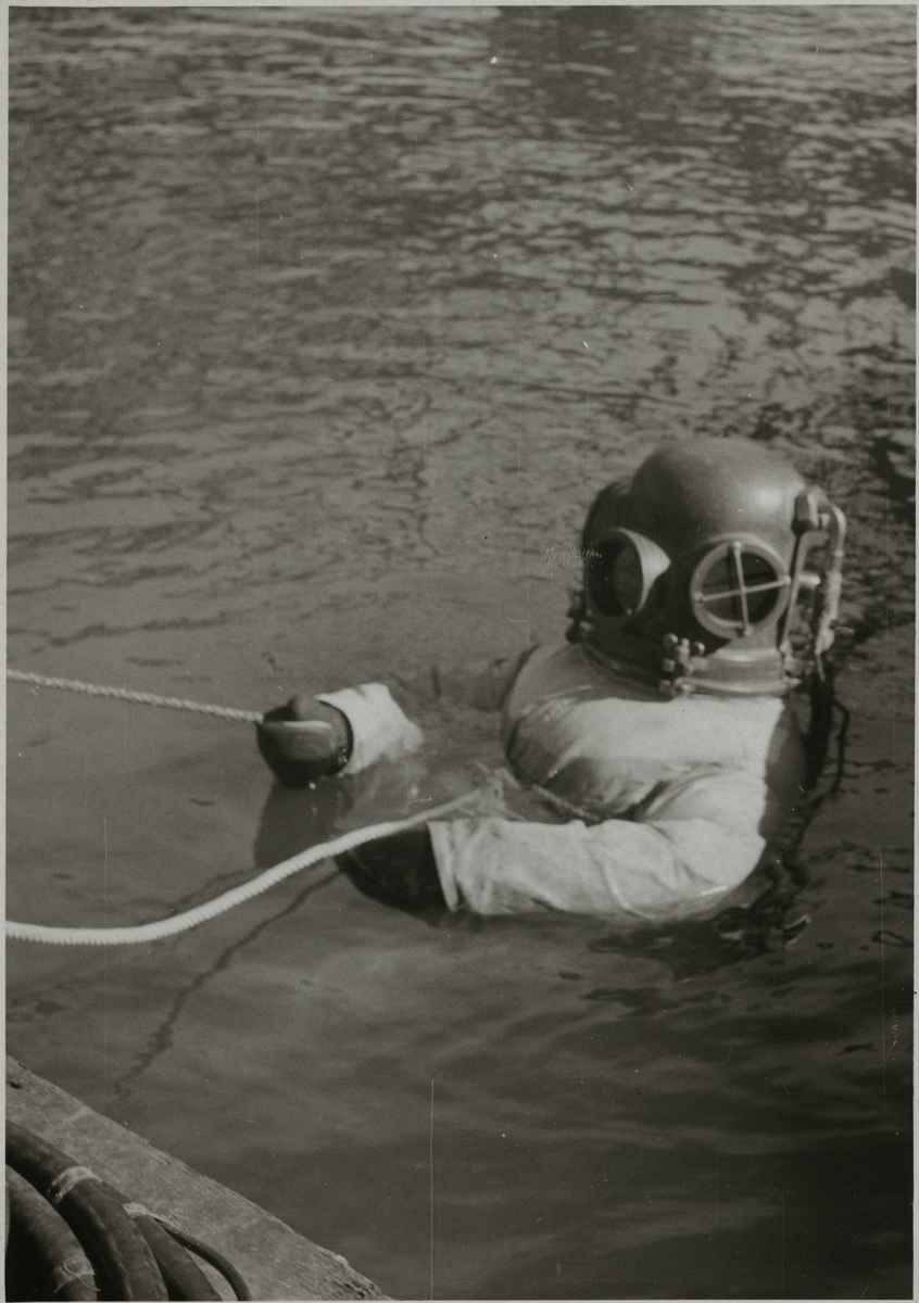 Dykare klar att gå ner och justera telefonkabeln vid Kvicksundsbron.