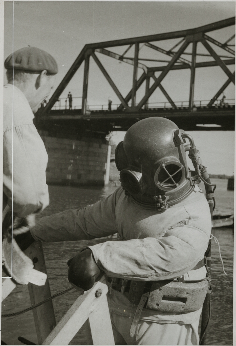 Dykare klar att gå ner och justera telefonkabel vid Kvicksundsbron.