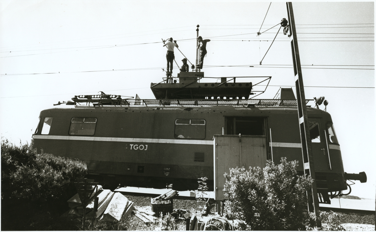 Trafikaktiebolaget Grängesberg - Oxelösunds Järnvägar, TGOJ Q13 9351, en elrevisionsvagn av tysk tillverkning, med höjbar arbetsplattform.