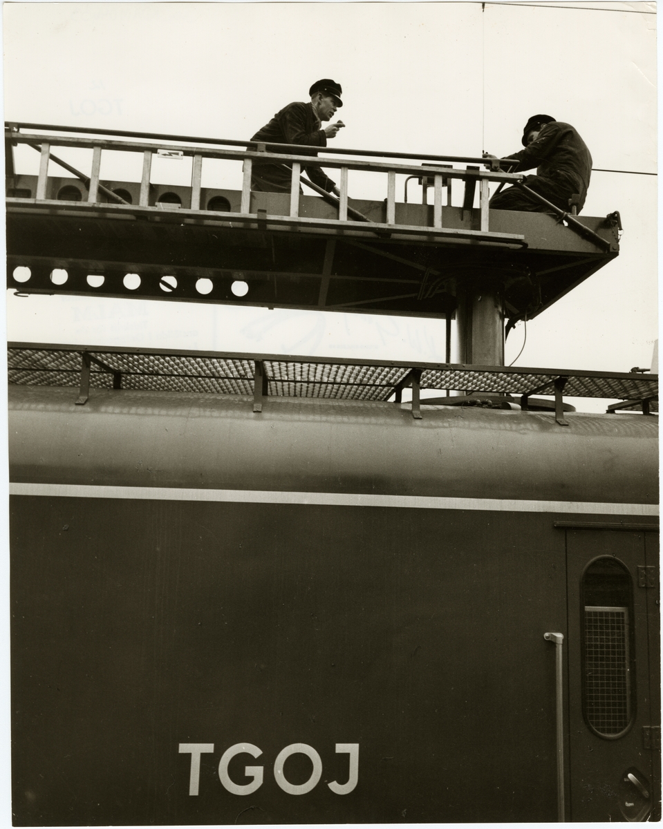Kontaktledningsarbete från den höjbara arbetsplattformen på TGOJ:s servicefordon. Trafikaktiebolaget Grängesberg - Oxelösunds Järnvägar, TGOJ Q13 9351, en elrevisionsvagn av tysk tillverkning.