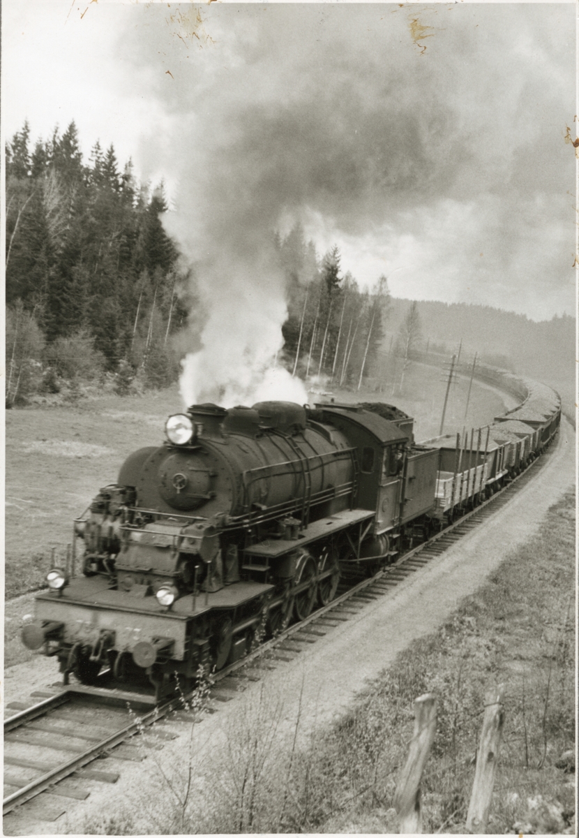 Trafikaktiebolaget Grängesberg - Oxelösunds Järnvägar, TGOJ M3t 73 framför ett antal malmvagnar i en uppförsbacke.