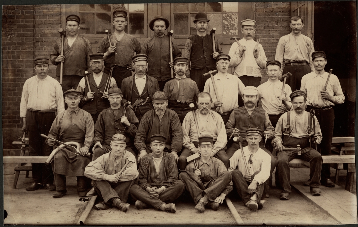 Verkstadspersonal vid ett av bolagen som senare blev Trafikaktiebolaget Grängesberg - Oxelösunds Järnvägar, TGOJ.