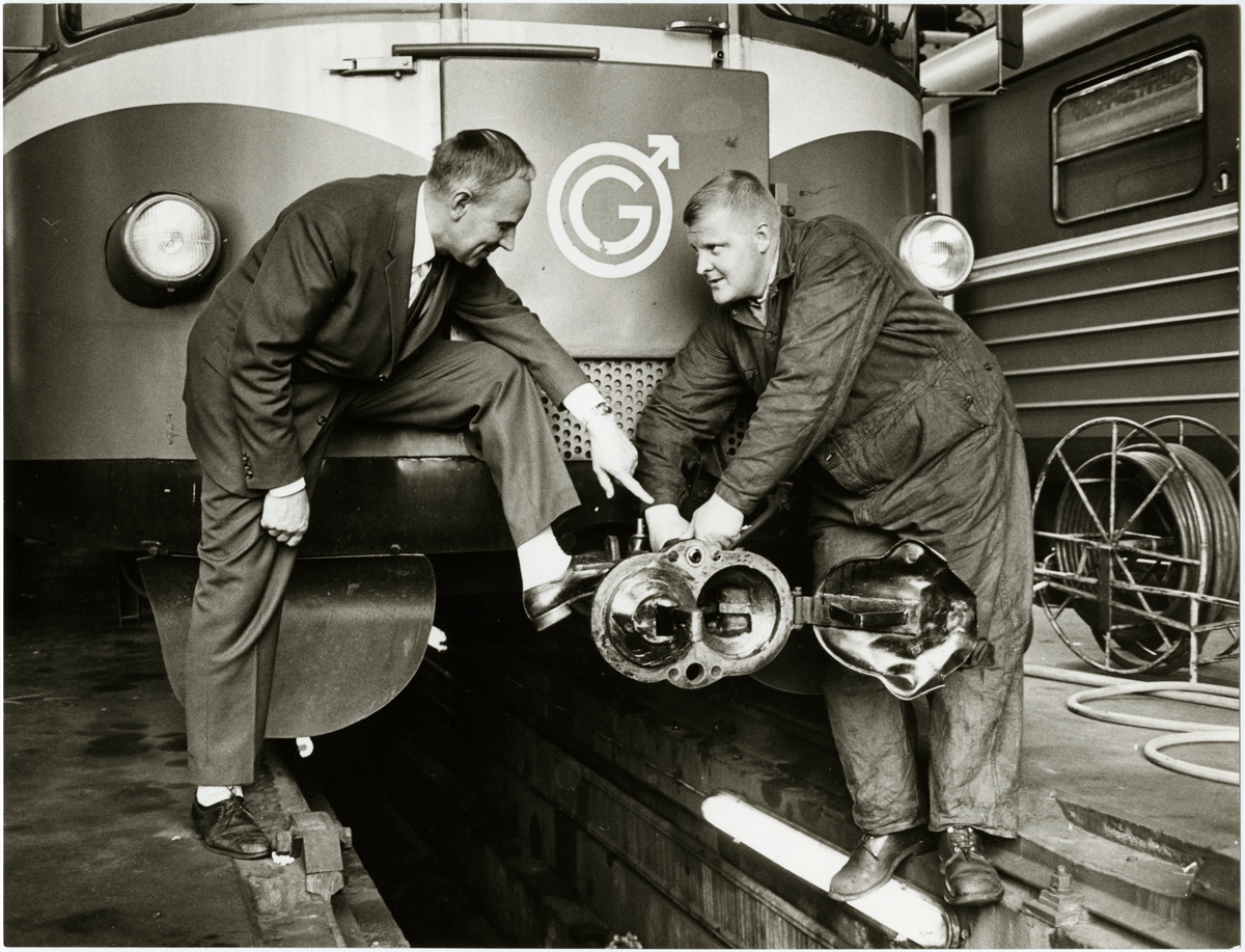 Verkmästare Folke Holmberg och reparatör Bo Elfkvist kontrollerar en koppling vid Trafikaktiebolaget Grängesberg - Oxelösunds Järnvägar, TGOJ verkstad i Eskilstuna.