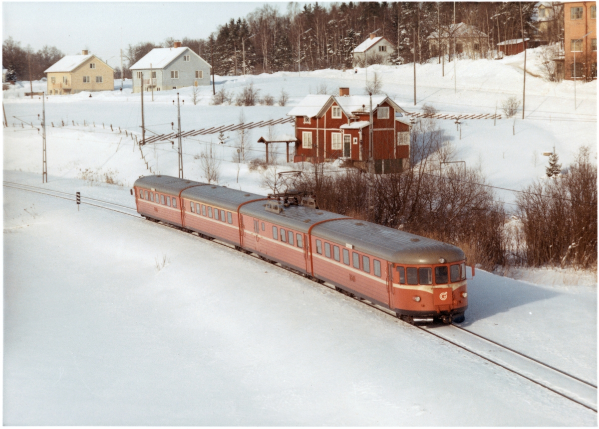Trafikaktiebolaget Grängesberg - Oxelösunds Järnvägar, TGOJ Yoa104 rälsbusståg på linjen mellan Mellösa och Flens Övre under vintertid.