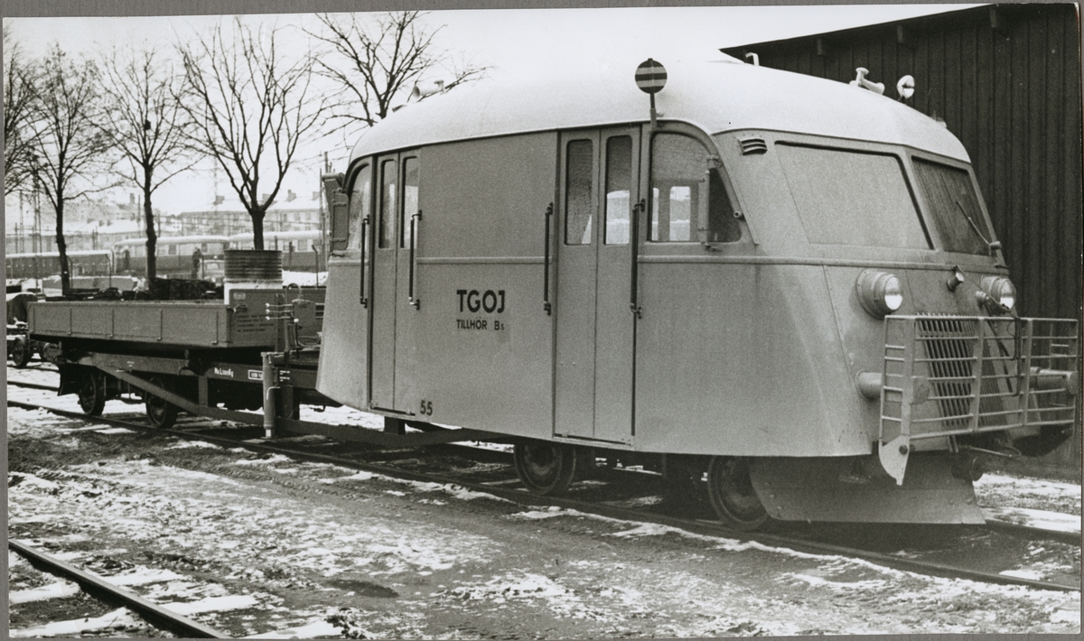 Trafikaktiebolaget Grängesberg–Oxelösunds Järnvägar, TGOJ rälsbuss ombyggd till lasttralla med kran.