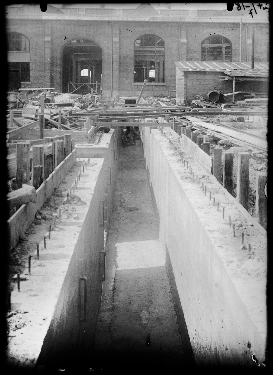 Byggnation av vagnverkstaden vid Statens Järnvägars Järnvägsverkstäder i Kirseberg, Malmö.