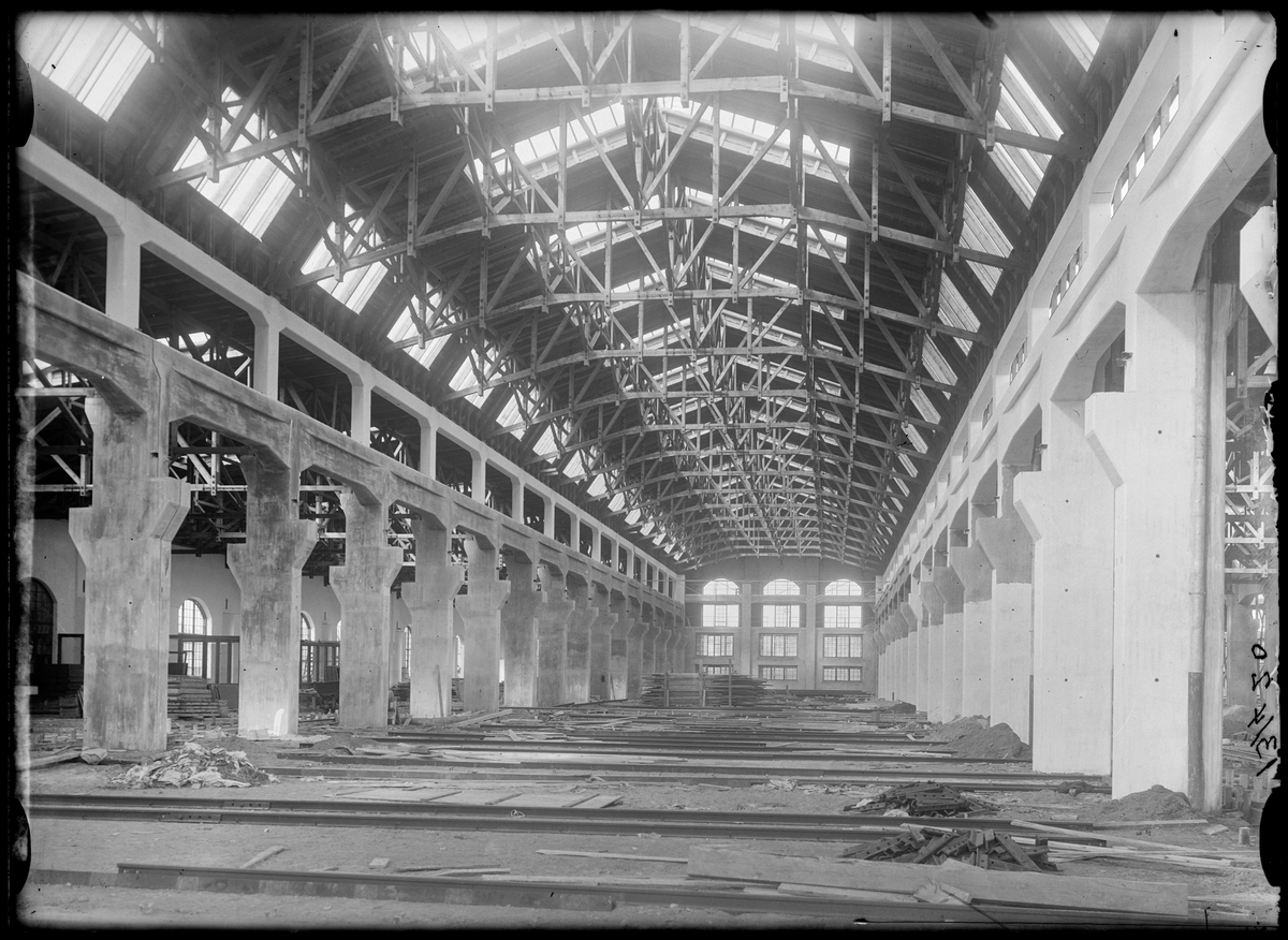 Byggnation av lokverkstaden vid Statens Järnvägars Järnvägsverkstäder i Kirseberg, Malmö.