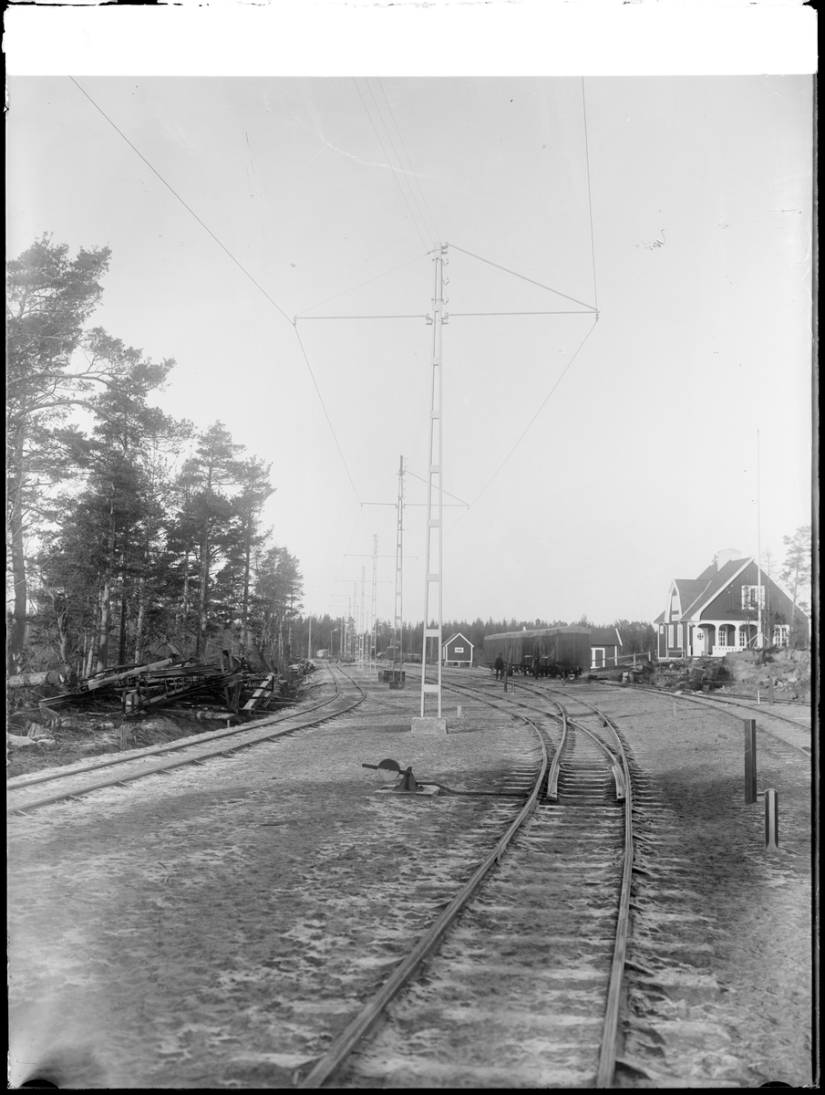 Bangården vid Skoghall station. Kontaktledningstolparna hörde till Skoghalls sågverks bana, som bland annat användes för att transportera arbetare till och från verket.