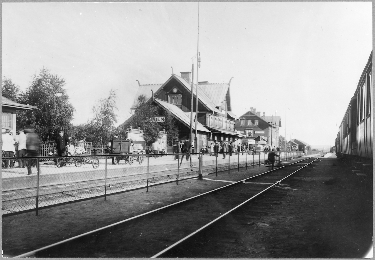 Bodens stationshuset från spårsidan. Resande på plattformen.