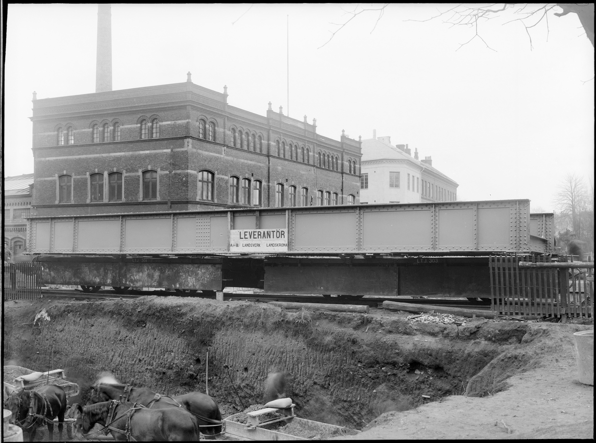 Vid byggnationen av vägporten över Trollebergsvägen i Lund, 1931. Bron för nedspår stående på vagnar före lossningen.