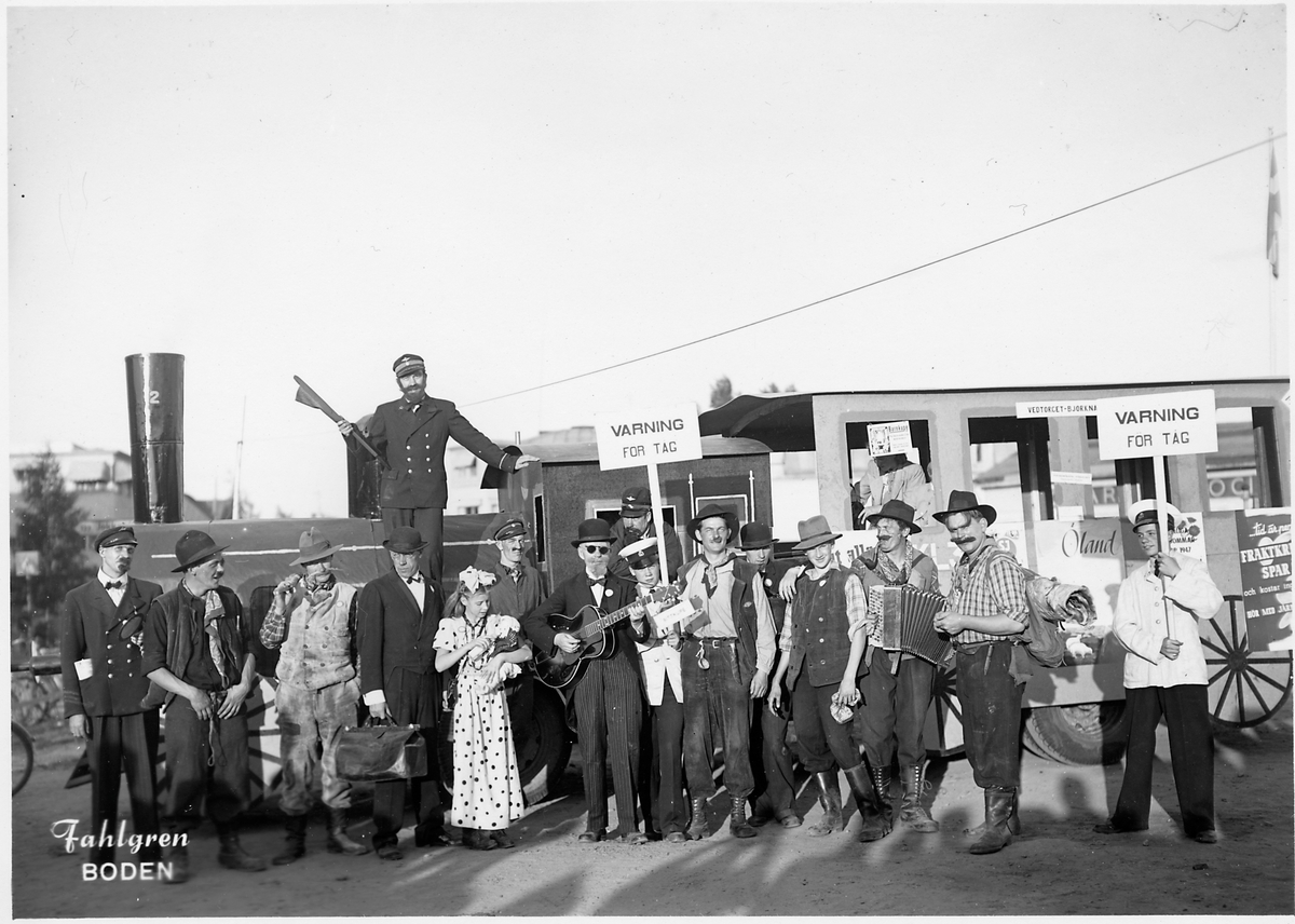 Statens Järnvägar, SJ reklamlok vid barnens dag i Boden 1947. Teatergrupp framför loket. Text på bilden - Fahlgren Boden.