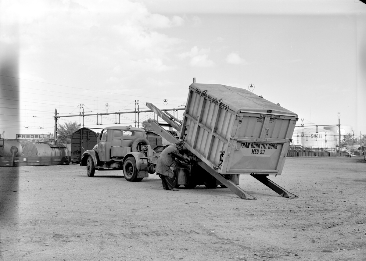 Öppna storbehållare lastas med Ackermanssläp vid vid Värtans station