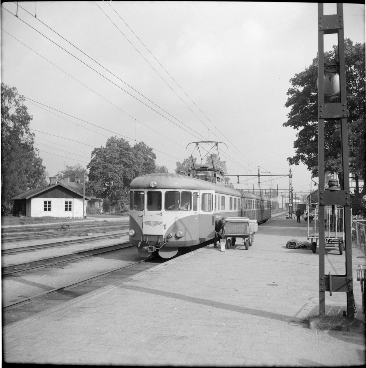 Nordmark - Klarälvens Järnvägar, NKlJ YOap "Uddeholmaren" står bredvid bagagevagn på järnvägsstation.