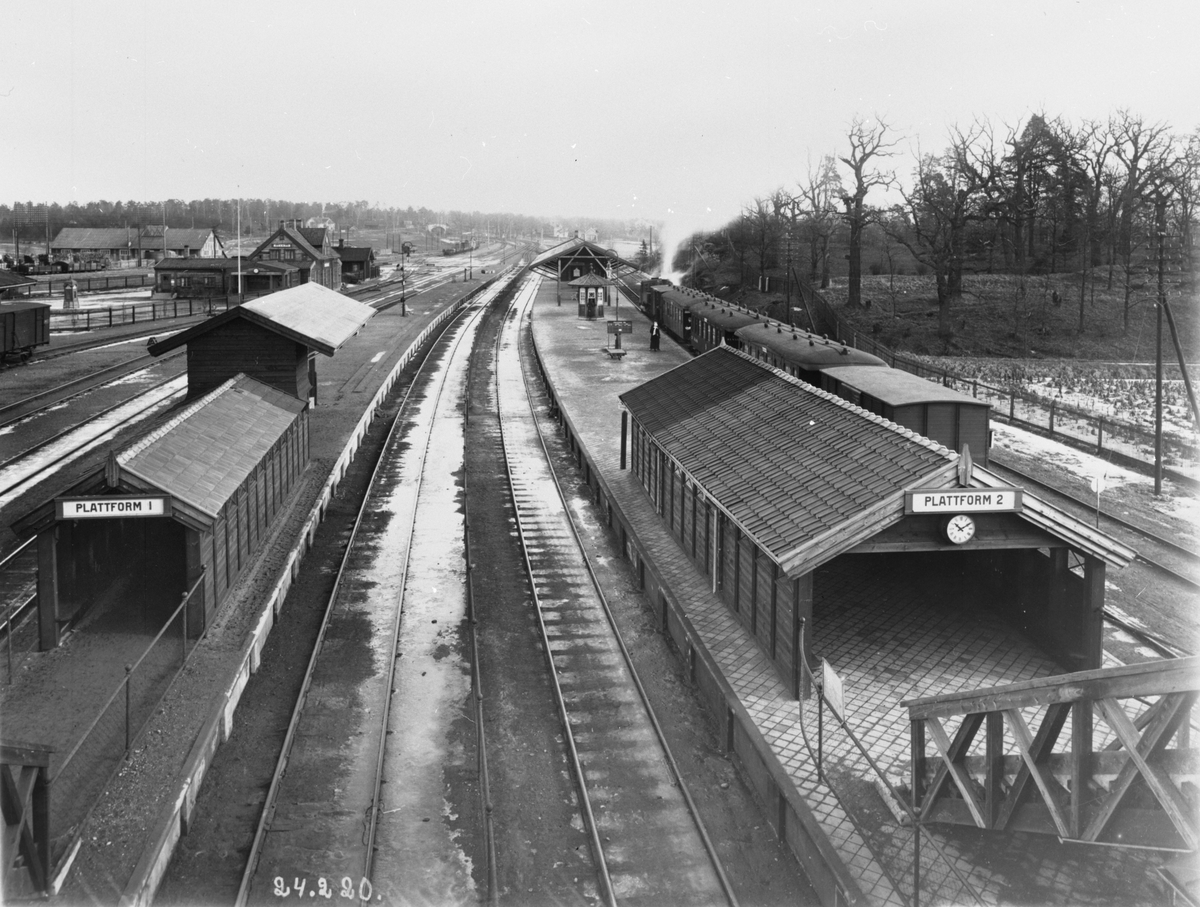 Plattformar. Stationen öppnades 1879. Stationshuset var då ett tvåvånings trähus med bostadslägenhet i övervåningen. 1917 byggdes ett nytt stationshus. Bangården har byggts om flera gånger. Elektriskt ställverk 1938.