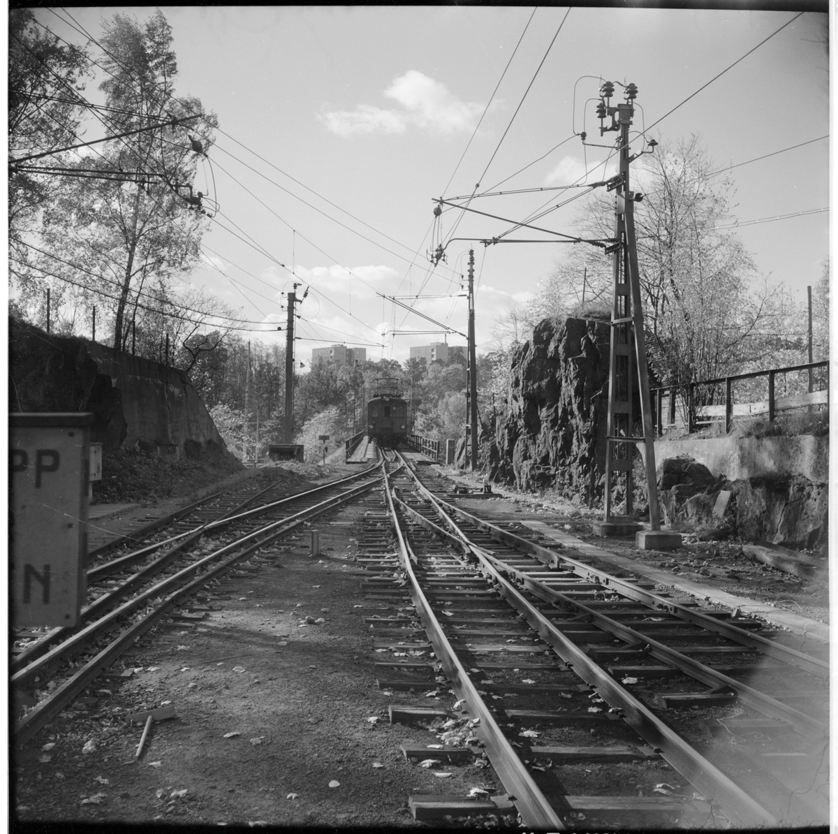 Järnvägsspår med växel och Stockholm - Roslagens Järnvägar, SRJ motorvagn 32 på järnvägsbron.