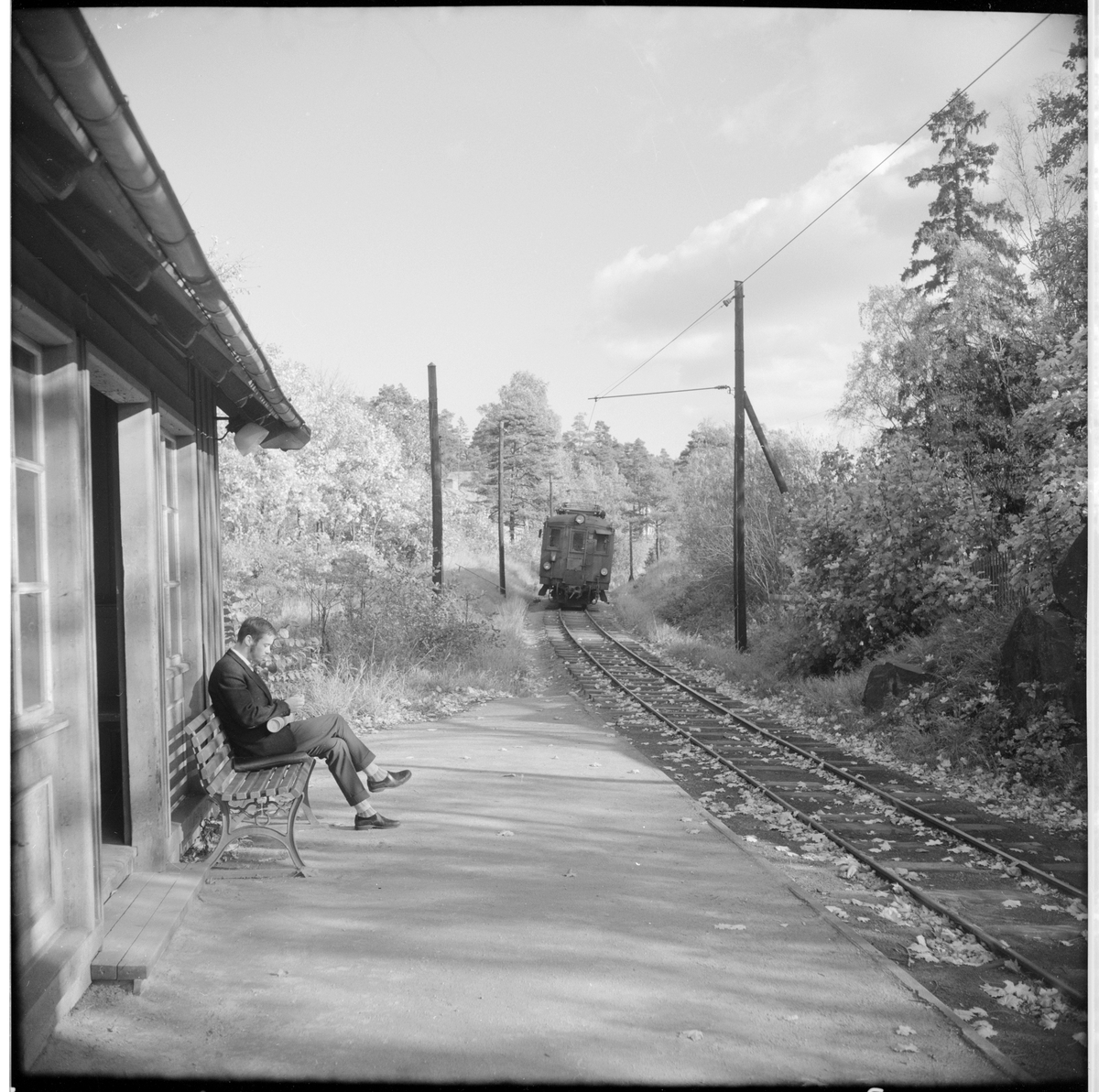 Vid Stockby hållplats ses resande till Stockholm - Roslagens Järnvägar, SRJ motorvagn.