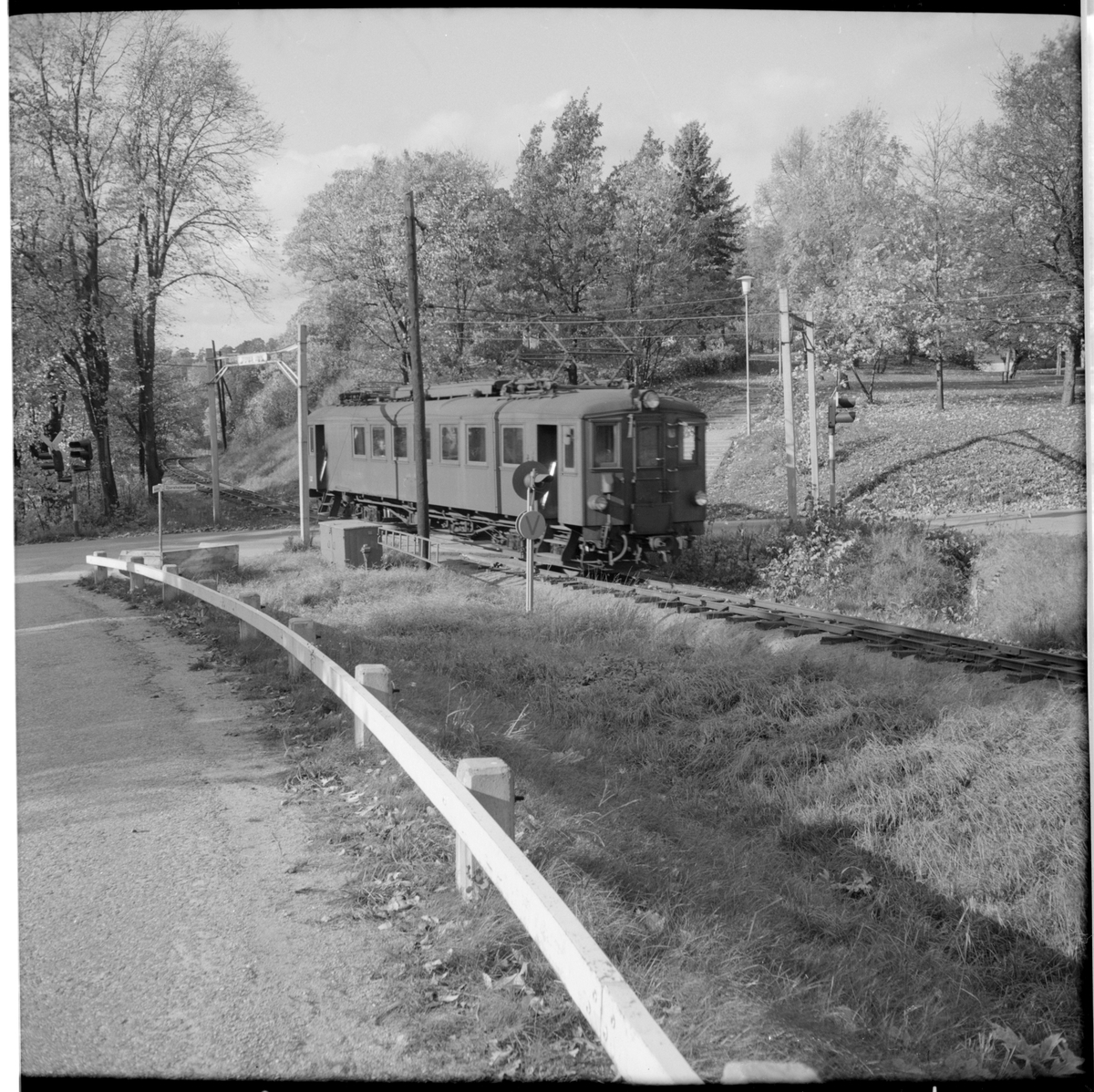 Stockholm - Roslagens Järnvägar, SRJ motorvagn 32 på järnvägsövergången.