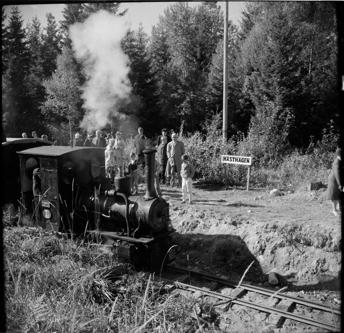 Museijärnvägen Östra Södermanlands Järnväg, ÖSlJ. Resande till ÖSlJ lok 2 "Lotta" utanför loket vid hållplats "Hästhagen".