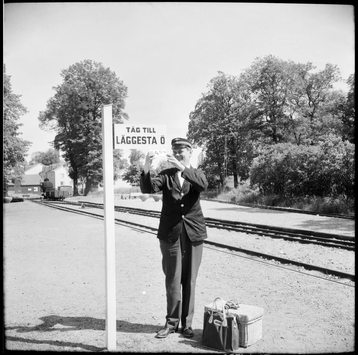 Personal hänger upp tiden för nästa avgång till Läggesta övre på Östra Södermanlands Järnväg vid Mariefred station.