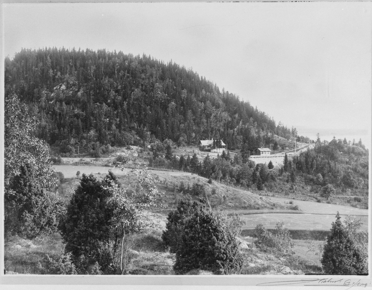 Vy över Vistakulle station från norr. På kullen till höger utsiktspaviljongen därefter stationshuset och hotellet.