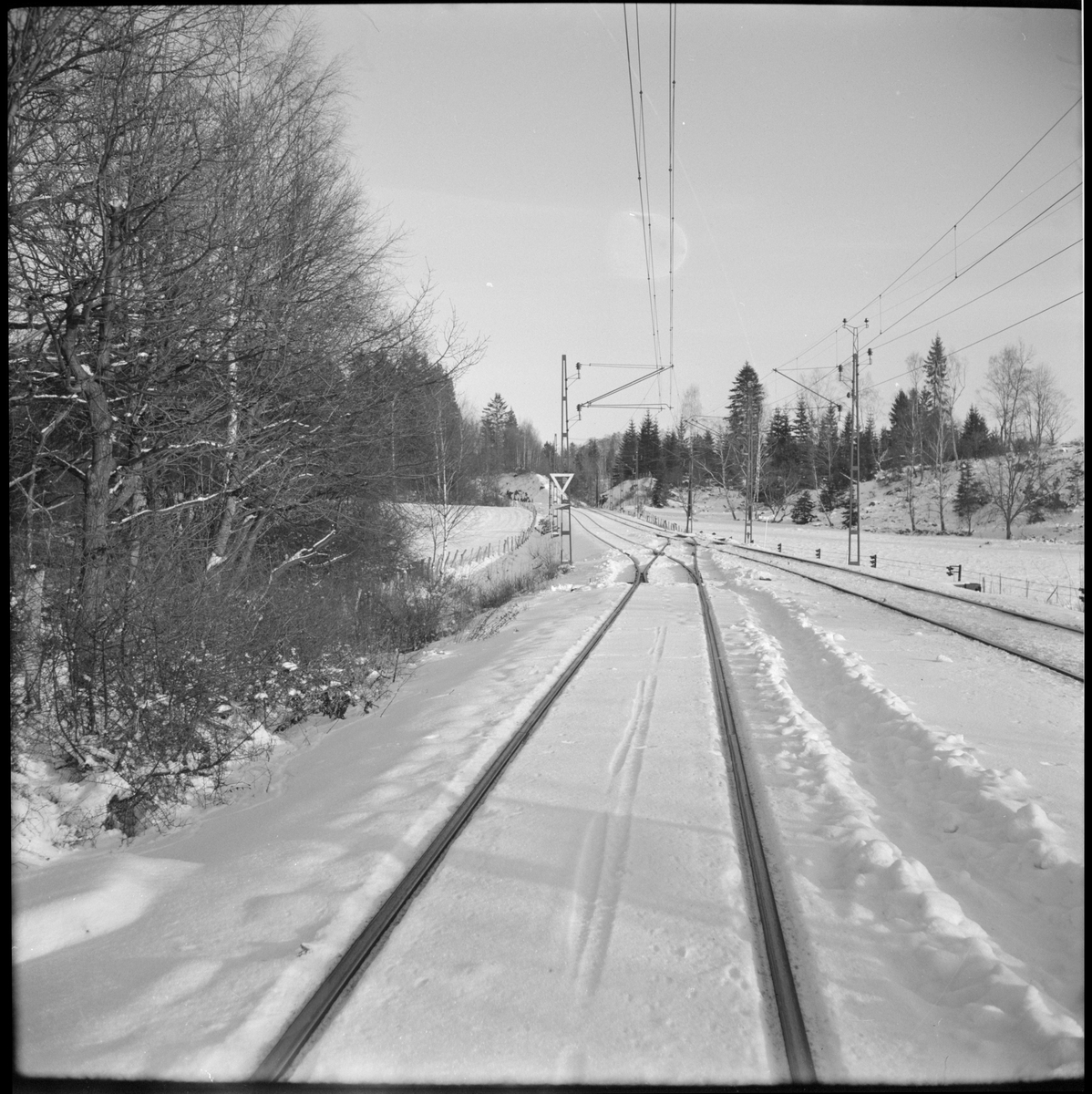 Vy över vintrigt järnvägsspår.