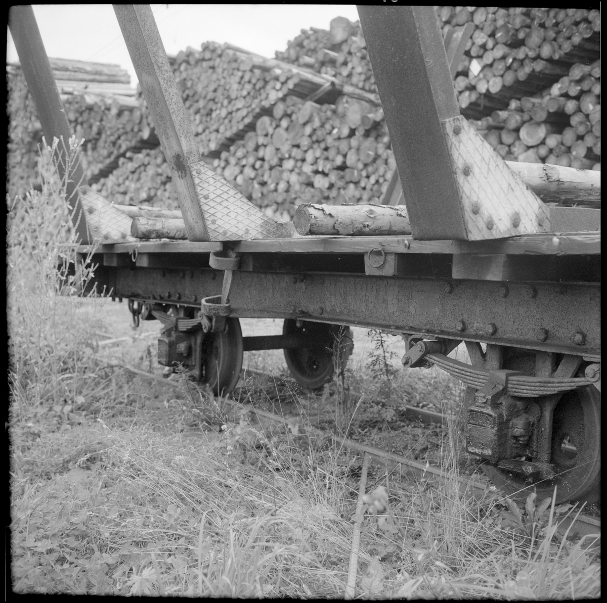 Timmer godsvagn bredvid den väl travade timmer högen.