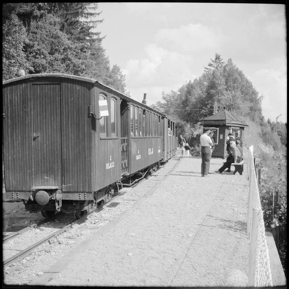 Persontåg, tillhörande Östra Södermanlands Järnväg, ÖSlJ vid hållplats på sträckan Läggesta - Mariefred vid Läggesta Östra station. Stationshuset är en kur från Saltsjöbanan.