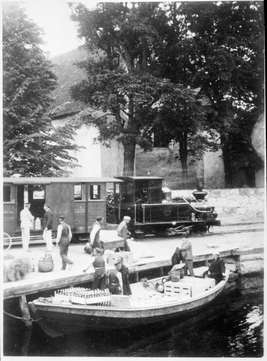 Ånglok framför kyrkogårdsmuren. Leverans av gods från personvagnen till frakteka vid Nättrabyån.