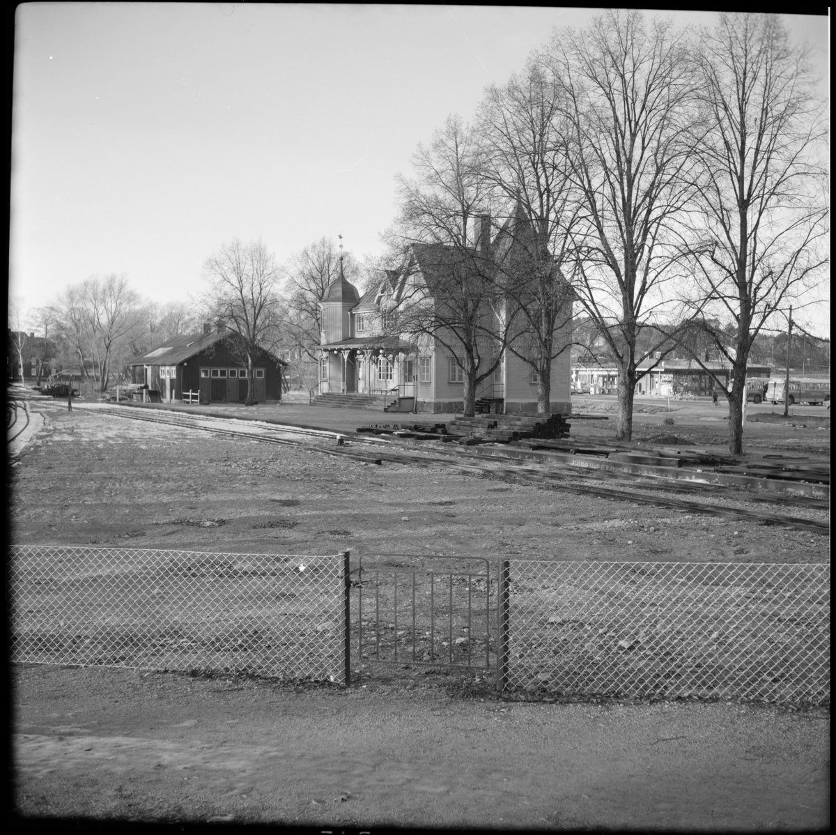 Vy över järnvägsstationen i Mariefred som användes av Museijärnväg Östra Södermanlands Järnväg, ÖSlJ. Stationhuset till höger i bild.