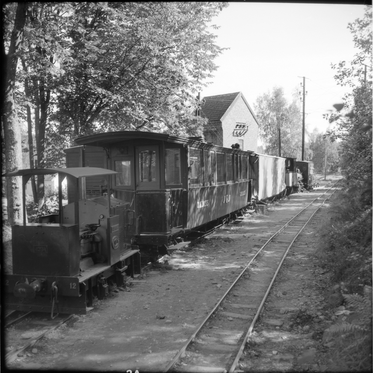 Närmast i bild Museijärnvägen Östra Södermanlands Järnväg, ÖSlJ lok 12 "Grefven" därefter Jönköping - Gripenbergs Järnväg, JGJ 3:e klass personvagn. I bakgrunden ses ett transformator hus.